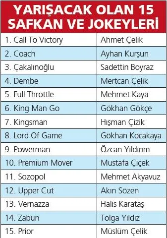 Hayatları boyunca Gazi Koşusu'nda bir kez boy gösterebilen tayların, 3 yaşını da doldurmuş olması gerekiyor. Bugünkü yarışta otoritelerin favorisi, son 5 yılın şampiyonu Ahmet Çelik'in bineceği Call to Victory...