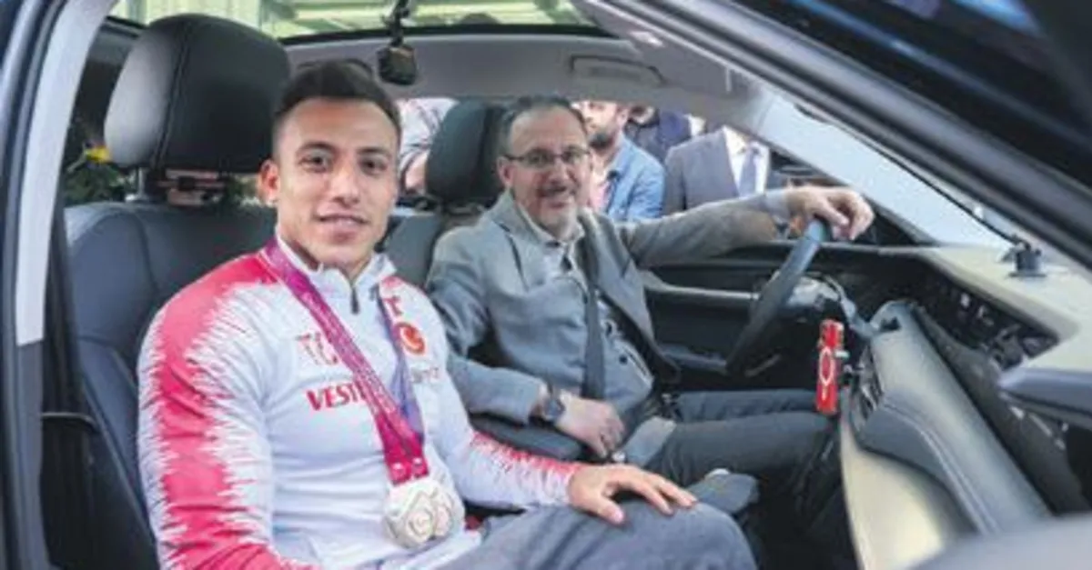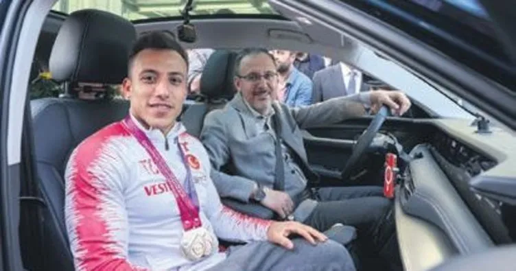 2 altın madalya kazanan Adem Asil ve diğer sporcularla Togg'a binerek havalimanından ayrıldı.
