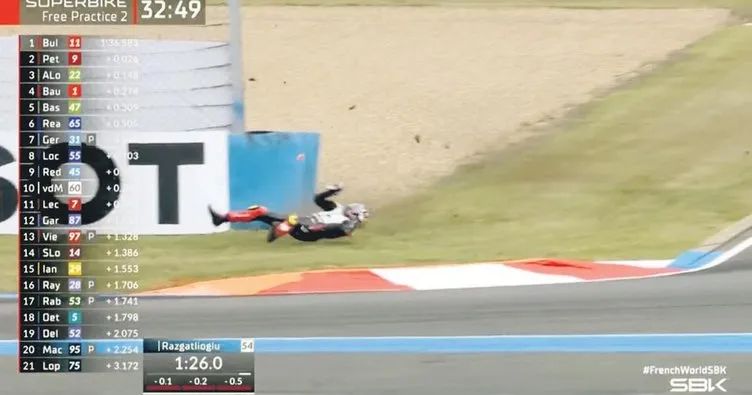 Milli motosikletçimiz Toprak Razgatlıoğlu, Dünya Superbike Şampiyonası'nın 8. ayağı için yapılan antrenman turlarında talihsiz bir kaza yaşadı. Fransa'daki 4.41 kilometre uzunluğundaki Magny-Cours pistinde bugün ve yarın yapılacak yarışlar öncesinde Razgatlıoğlu, antrenman turlarında bir virajı dönerken kaydı ve ardından motorundan fırladı. Sonrasında belini sert bir şekilde bariyerlere çarpan sporcumuz için sağlık görevlileri elle yapılan ilk kontrollerde bir soruna rastlamadı. Hastaneye götürülen ve MR'ı çekilen Toprak'a "hafif travmatik pnömotoraks" tanısı koyulurken hafta sonunun geri kalanında yarışamayacak.
