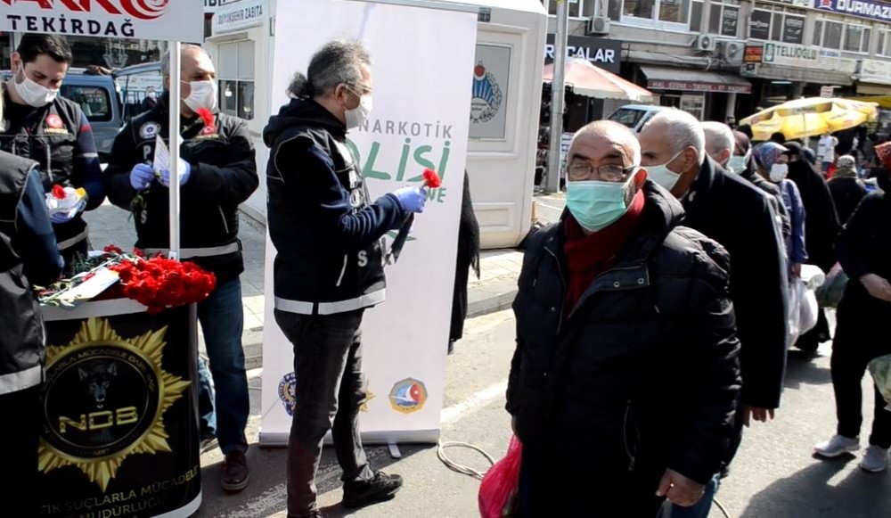 Tekirdağ İl Emniyet Müdürlüğüne bağlı narkotik polisleri, 8 Mart Dünya Kadınlar Günü sebebiyle kadınlar için şehirde karanfil dağıttı. Karanfil dağıtıldığını gören ihtiyar delikanlılar zaman zaman sıraya girip karanfil almak istedi. Karanfil dağıtımı sırasında polis ile yaşlı delikanlılar arasında geçen muhabbet etraftakileri kahkahaya boğdu. Tekirdağ İl Emniyet Müdürlüğüne bağlı Narkotik Şubesine bağlı ekipleri ‘En iyi narkotik polisi anne’ projesi kapsamında 8 Mart Dünya Kadınlar Günü sebebiyle Süleymanapaşa İlçesindeki farklı noktalarda kadınlara karanfil ve bilgilendirme broşürü dağıttı. Karanfil dağıtıldığını fark eden bazı yaşlı erkeklerde polisin karanfil dağıttığı noktaya gelerek, “Erkekler gününde de böyle karanfil dağıtıyor musunuz? Yok ki erkekler günü olsun. Bir gülde bana verin hanıma götüreyim. Biz kadınlara götüreceğiz herhâlde cebimize koymayacağız. Belki paramız yok paramız olsa alırız” diyerek etraftakileri gülümsetti.
