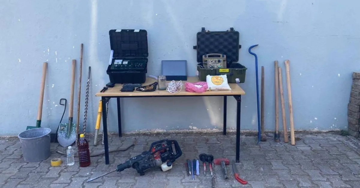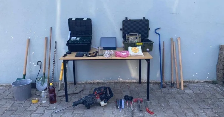 Olay yerinde yapılan araştırmada ;1 adet hazine tespit cihazı,1 adet yer altı boşluk tarama cihazı, 1 adet laptop, 3 adet murç, 5 adet hilti ucu, 3 adet keski, kazma, 1 adet balyoz, 1 adet levye, 1 adet testere, 2 adet kürek, 2 adet kazma sapı, 1 adet kova,1 adet çekiç, 5.5 kilogram kaya kırıcı toz (Akfil), 10 metre kablo, 20 gram barut ,0.250 gram cam macunu, 1 adet powerbank ele geçirildi. Şahıslar hakkında adli tahkikat başlatıldı.