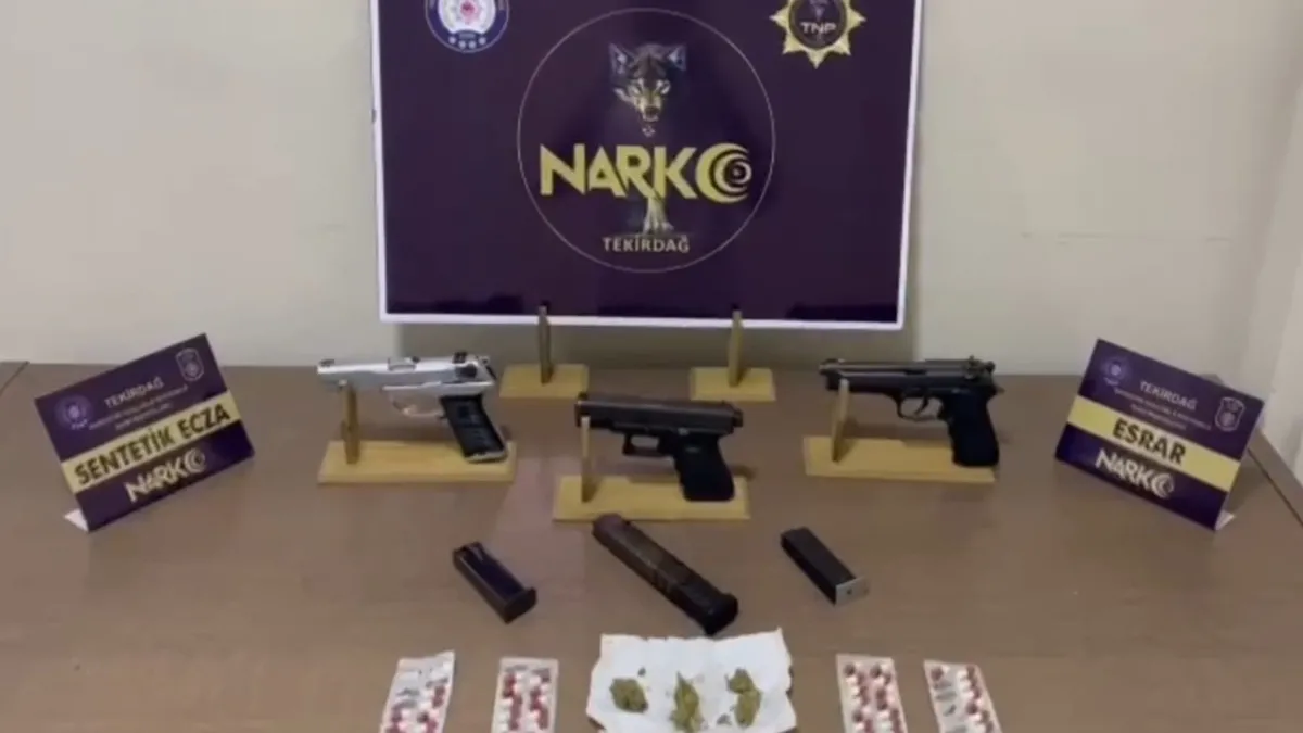 Tekirdağ İl Emniyet Müdürlüğü Narkotik Suçlarla Mücadele Şube Müdürlüğü, Çorlu Narkotik Şuçlarla Mücadele Büro Amirliği ekiplerince, uyuşturucu ve uyarıcı madde ticareti yapanlara yönelik yapılan operasyonda, Çorlu'da 1 adreste yapılan aramada, 4 fişek esrar, 41 Adet Galara ibareli sentetik ecza hapı, 3 ruhsatsız tabanca (Tabancalardan biri seri aparatlı) ele geçirildi. gözaltına alınan 3 kişiden 1'inin kasten yaralama, silahlı tehdit, görevi yaptırmamak için direnme, birden fazla kişi ile birlikte silahlı tehdit, alkollü araç kullanma suçlarından aranma kaydının olduğu tespit edildi.