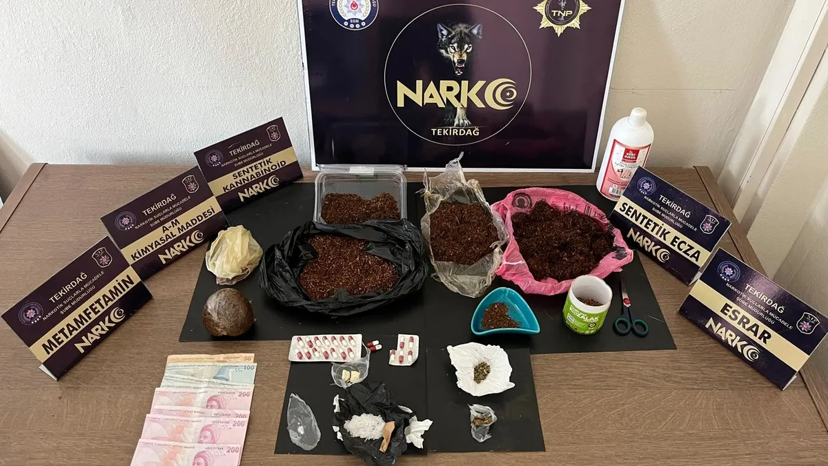 Yapılan aramada 7 parça halinde 770 gram sentetik kannobinoid, 8 gram metamfetamin, 3 gram esrar, 4 gram gelen saf A-M kimyasal madde, 315 mil aseton, 21 adet Galara 300 miligram sentetik ecza hapı, uyuşturucu madde ticaretinden elde edilen bin 150 TL para ele geçirildi.