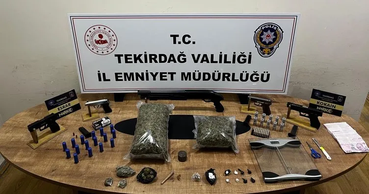 Yapılan aramada, bin 450 gram esrar, 20 gram kokain, 1 terazi, 1 esrar öğütücü, uyuşturucudan elde edilen 12 bin 800 TL para, 4 ruhsatsız tabanca, 47 tabanca fişeği, 1 ruhsatsız tüfek, 26 tüfek kartuşu, 10 bin adet sigara sarma kağıdı, 780 adet elektronik sigara likidi, 10 bin adet bandrolleri kesilmiş boş makaron, 49 bin 600 adet bandrollü boş makaron, 26 kilogram bandrollü tütün, 15 kilogram açık kıyılmış tütün, bin 600 adet içi tütünle dolu makaron, 1 adet tütün sarma makinesi, 1 adet puro tütün makinesi besleme haznesi ele geçirildi.