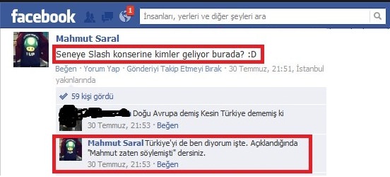 - Konser öncesinde, mekanın çevresini gezerken birçok kişi giyimimden ötürü beni Slash sanıp, imza için yanıma koştu. Kimi yemek yediği masadan kalktı, kimi yürüyen merdivenlerin orada görüp "Aha bu Slash değil mi?" diyerek şaşkınlıkla bana baktı. Tabii gerçeği anlamaları uzun sürmedi, ancak kısa süreliğine de Slash sanılmak güzel bir duyguymuş.