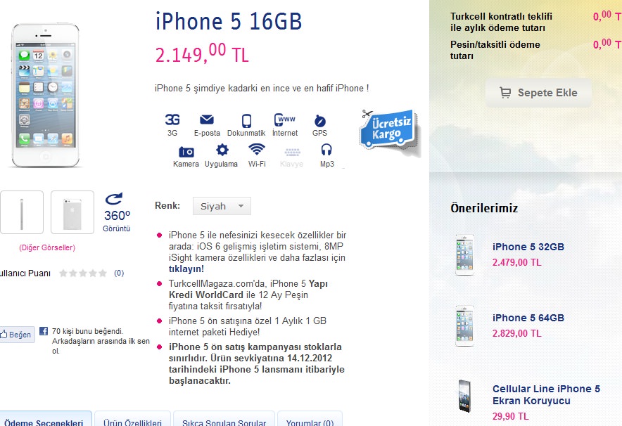 Şimdiye kadarki en ince ve hafif iPhone olan iPhone 5, şu an 2.149 TL fiyatıyla ön satışta (16GB model için bu fiyat). İlgili sayfaya ulaşmak, diğer modellere, taksitli ve tarifeli seçeneklere de bakmak için buraya tıklamanız yeterli.