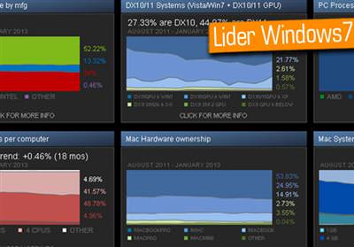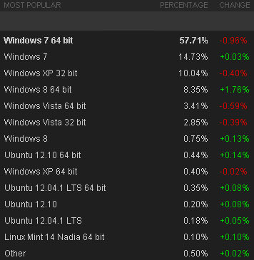 Oyun platformlarından birisi olan Steam, 2013 yılının Şubat ayında en çok kullanılan işletim sisteminin raporunu yayınladı. Steam'in "Donanım ve Yazılım Anketi: Şubat 2013" araştırmasına göre en çok kullanılan işletim sistemi %57,71 ile Windows7 64 bit olduğunu görüyoruz. En büyük artışsa %1.76 ile Vista'yı geride bırakan Windows 8 olduğu görülüyor. Günümüzde 32 bitli işletim sistemlerinin kullanımının düştüğünü ve yerine 64 bitli işletim sistemlerine geçilmesi de dikkat çekiyor.
