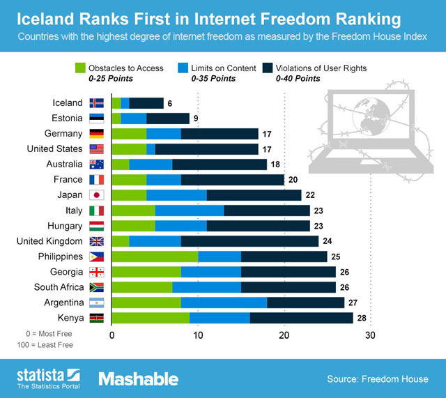 Freedom House isimli kuruluş ise geçtiğimiz günlerde dünya üzerindeki ülkelerin internet özgürlüklerine dair bir araştırma yapmış. Bu araştırmanın sonucunda ise internette en özgür ülkenin İzlanda olduğu ortaya çıkmış. Araştırmayı yapan kuruluşun belirlediği ölçülerle yapılan puanlamada İzlanda'nın sadece 6 engel puanı bulunuyor.