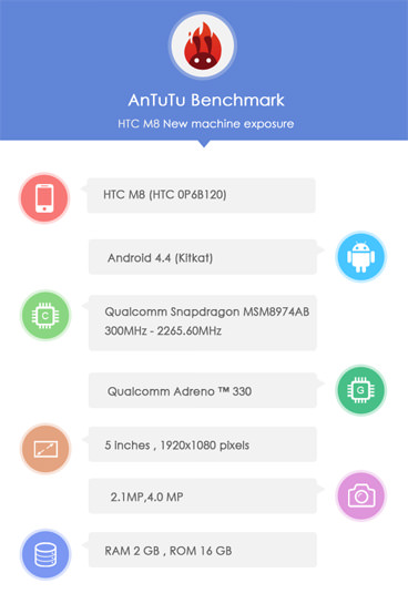 Yayınlanan AnTuTu Benchmark görsellerine göre HTC M8, 5 inç büyüklüğünde ve 1920 x 1080 piksel çözünürlüğünde ekrana sahip. Gücünü Qualcomm'un 2.3 GHz saat hızında çalışan dört çekirdekli işlemci barındıran Snapdragon 800 yonga setinden alan cihaz, 2 GB RAM ve 16 GB dahili depolama alanı sunuyor. Ayrıca, bu yonga setinin standart Snapdragon 800'den daha hızlı olan 8974AB versiyonu olduğunu da belirtelimCihazın arka tarafında 4 megapiksel çözünürlükte UltraPixel teknolojili kamera yer alırken, ön tarafta ise 2.1 MP'lik ikinci bir kamera bulunuyor.