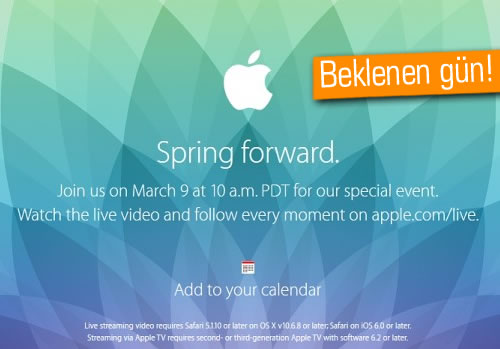 Apple, 9 Mart, yani yarın özel bir etkinlik düzenleyecek. Pasifik saat dilimiyle öğleden önce 10:00'da başlayacak (Muhtemelen ülkemizde 18:00 gibi) olan etkinlik, canlı olarak apple.com/live adresinden (Apple sistemlerine özel olabilir) de takip edilebilecek.