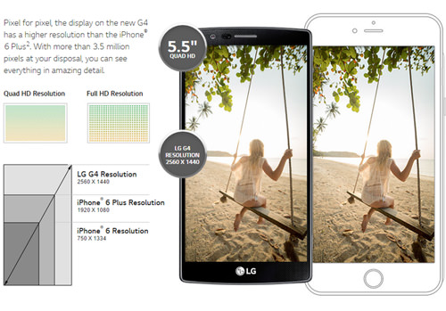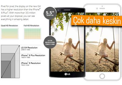 Bu görüntüde ise LG'nin G4'ü iPhone 6 Plus'la karşılaştırması dikkat çekti. LG, iki telefonu ise ekran konusunda karşı karşıya getirmiş. LG, görüntüyle beraber LG G4'ün ekran çözünürlüğünün iPhone 6 Plus'a oranla çok daha fazla olduğunu anlatıyor.
