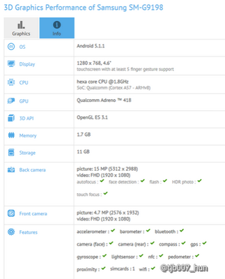 GFXBench'te ortaya çıkan Samsung SM-G9198 kod adlı telefon, LG G4'te kullanılan Snapdragon 808 çipsetle geliyor. Bunun yanında 4.6-inç büyüklüğünde ve 768 x 1280 piksel çözünürlüğünde ekranla gelen cihaz, Android 5.1.1 ön yüklü olarak çıkacak. Altı çekirdekli 1.8GHz CPU'dan güç alan model, Adreno 418 GPU, 2 GB RAM, 16 GB dahili depolama alanı, 16 MP arka kamera, 5 MP ön kamera gibi özellikler sunacak.