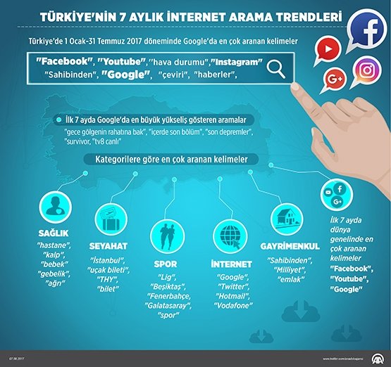 Türkiye'deki internet kullanıcıları, 1 Ocak-31 Temmuz 2017 döneminde arama motoru Google'da en çok "Facebook", ''Youtube", "hava durumu", "Sahibinden", "Google", "haber", "son dakika", "çeviri", "haberler", "Instagram" kelimelerini aradı.