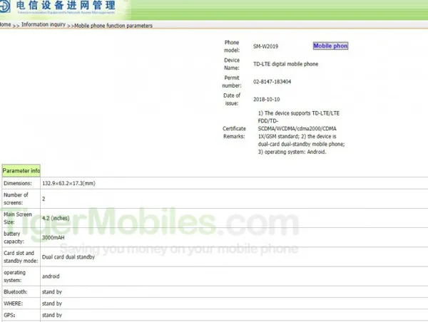 Çin'in FCC'si olarak nitelendirilen TENAA'nın paylaştığı bilgilere göre Galaxy W2019'da iki adet 4.2 inç'lik Super AMOLED ekran var. Ayrıca cihaz 3000 mAh pile sahip.