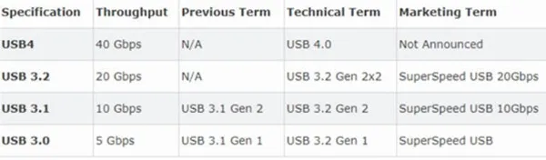 USB 4.0 ile birlikte veri aktarım hızının 40 Gbps'ye ulaşabileceğini belirtmiştik. Yeni USB standardı, USB 3.2'ye göre iki kat daha fazla hız sunuyor. Şimdi de USB standartlarını bir tabloda karşılaştıralım: