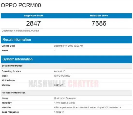 Diğer yandan PCRM00 model numaralı Oppo Reno 3 Pro 5G'nin 8 GB RAM'li modeli Geekbench'te ortaya çıktı. Geekbench sonuçlarında yonganın adı geçmese de, Oppo, telefonda Snapdragon 765G'nin olacağını açıklamıştı. Telefonun işletim sistemi de Android 10. Reno 3 Pro 5G tek çekirdekte 2847, çoklu çekirdekte ise 7686 puan almayı başarmış.