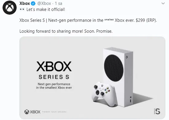 Xbox'ın Twitter hesabında yapılan paylaşımda Xbox Series X fiyatı 299 dolar olarak açıklandı. Xbox'ta yeni nesil performans sloganı ile tasarımı gözler önüne serilen konsolun teknik özellikleri şu anda bilinmezliğini koruyor. 'Daha fazlasını paylaşmak için sabırsızlanıyoruz! Yakında.' ifadeleri kullanılıyor.