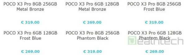 Avrupa'daki bir perakendecinin listesine göre Poco X3 Pro'nun 6 GB RAM ve 128 GB dahili depolama alanına sahip modeli 269 euro satış fiyatına sahip. 8 GB RAM ve 256 GB depolama alanı olan model ise 319 euro fiyatla satılacak. Telefonun bronz, mavi ve siyah renk seçenekleri olacak.