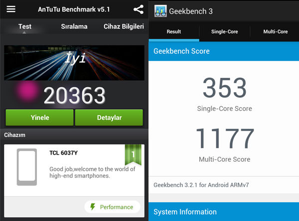 Normal uygulamalarda ve mobil bağlantı açıkken telefonun üst kısmında (Kamera tarafında) az biraz ısınma oluyor. Ama ağır uygulamalarda ısınma kendini belli ediyor. Dead Trigger 2'yi düşük veya en yüksek ayarlarda oynasam da, telefon kısa süre içinde ısındı. Alcatel OneTouch Idol 2'yi benchmark testine de tuttum. Cihaz AnTuTu'dan 20363 puan aldı. Geekbench 3'te tekli çekirdekte 353, çoklu çekirdekte ise 1177 puan almayı başardı. Benchmark'larda da ısınma oldu.