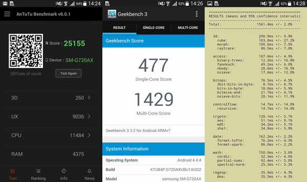 Ekrandan kasanın içine ve performansa doğru yolculuk edelim. Donanım bileşenlerini kağıda döktüğümüzde 1.2 GHz'lik Snapdragon 410 sistemçipi, Adreno 306 GPU, 1.5 GB RAM (2 GB RAM de olabilirmiş), 16 GB dahili depolama alanı listesiyle karşılaşıyoruz. Bunlar teknik olan kısımlar, bizi aslında cihazın performansı ilgilendiriyor. Açık konuşmak gerekirse Galaxy Grand Max'ın günlük performansını beğendim. Video izledim, müzik dinledim, internette sörf yaptım ve sosyal medya uygulamalarını da rahatça kullandım. Gelelim biraz daha ağır olan uygulamalara yani oyunlara. Unkilled, Real Racing 3 ve Marvel Şampiyonlar Turnuvası'nı oynadım. Açıkçası telefon oyunları oynatmada başarılı, oyunların yükleme ekranları da uzun değil. Ayrıca ekranın 720p çözünürlükte olması da performansı arttıran etkenlerden biri. Sentetik testler de olmazsa olmazlardan. Telefonun aldığı sonuçlar segmentindeki cihazlarla neredeyse aynı.