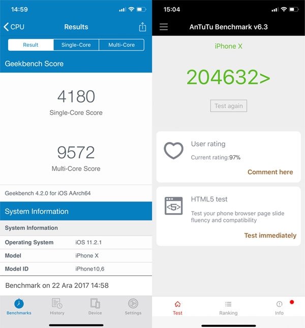 A11 Bionic'in teknik kısımlarını bir kenara atıp gelelim, iPhone X'in kullanım durumuna. 3 GB RAM'e sahip olan telefon hızlı ve yağ gibi akıyor. Günlük işlerde sorun yaşamazsınız. Facebook, Twitter, Safari veya Chrome gibi klasik uygulamalar hızlıca açılıyor. Oyunlara gelince Lineage2 Revolution, Life is Strange gibi görselliği yüksek oyunları oynadım, performans bir kere düşmedi. Tabii olmazsa olmaz benchmark testlerini yaptım. iPhone X, GeekBench 4'te tek çekirdekten 4180, çoklu çekirdekten 9572 puan aldı. AnTuTu puanı ise 204632. Yüksek sonuçlar.