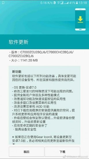 Samsung'un orta segment bazı modelleri Nougat'ı almaya başladı ve şimdi ise sıradaki telefon Galaxy C7 oldu. Çin'in sosyal ağı Weibo'da telefon için çıkan güncellemenin ekran görüntüsü de paylaşıldı.