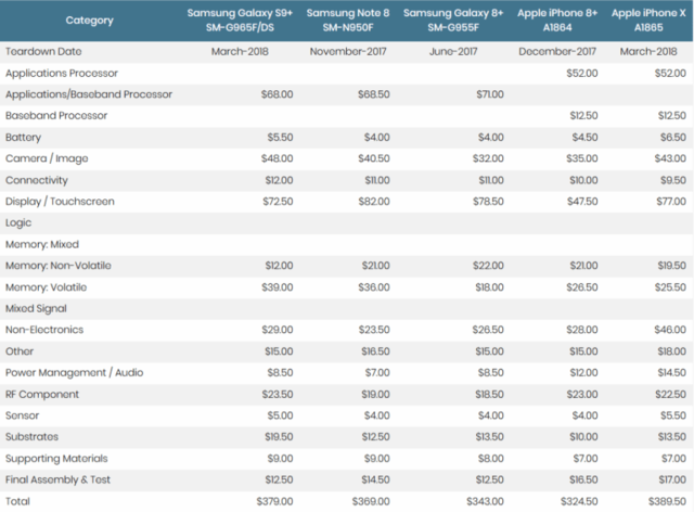 Diğer taraftan bir karşılaştırma için, aynı metotla yapılan araştırmada, Galaxy Note 8'in ise 369 dolara mal edildiğini görüyoruz. iPhone X ise 389.5 dolara mal ediliyor.