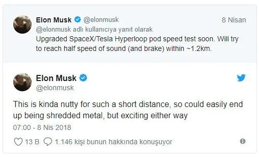 Musk, söz konusu kısa mesafede bu kadar yüksek bir hıza ulaşmanın çılgınca olduğunu kabul ederek, aracın parçalanmış metale dönüşebileceğini ancak her hâlükârda testin heyecan verici olduğunu söyledi.