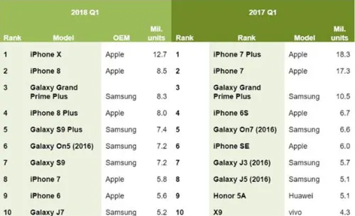 Peki rakiplerde durum nasıl? Samsung Galaxy Grand Prime Plus, 8.3 milyon adet ile en çok satan üçüncü model oldu. Bu akıllı telefonu sırasıyla 8 milyon ve 7.4 milyon adet ile iPhone 8 Plus ve Galaxy S9 Plus takip ediyor. Çin şirketler ise dünya genelinde pazar paylarını artırmalarına rağmen bu sene ilk 10'a girmeyi başaramadı.