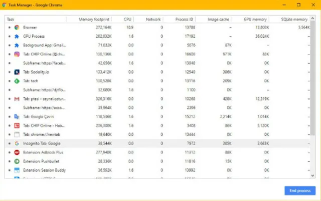 - Chrome'un görev yöneticisi, bilgisayarınızın işlemci ve RAM'ini en çok nelerin kullandığını gösteriyor. Burada elbette sadece Chrome'a ait girdileri görüyorsunuz.