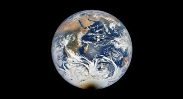 Paylaşılan görüntüde Güney Kutbu'nda siyah bir nokta görülüyor. Antarktika'nın üstündeki gölge, Güneş Tutulması'nın en fazla hissedildiği noktaları işaret ediyor. Bu görüntü Dünya'ya 1.5 milyon kilometre uzaklıkta kaydedildi.