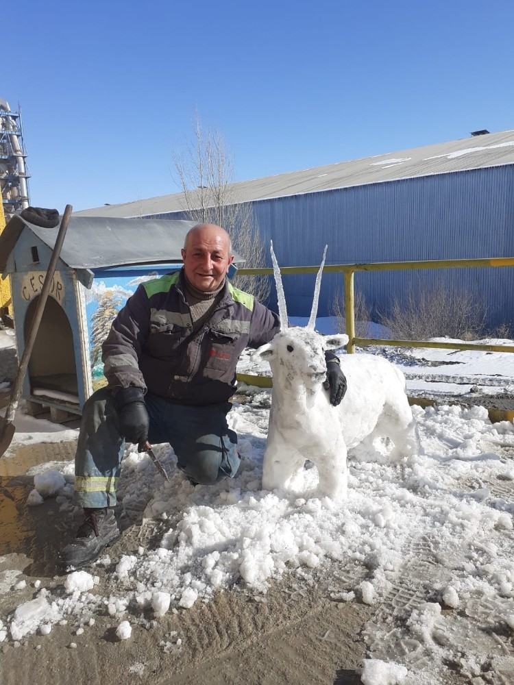 Artova ilçesinde çimento fabrikasında çalışan Mehmet Halil Tekin, kardan adeta sanat eserleri oluşturuyor. Bugüne kadar kardan insan büstü, köpek, at, eşek, horoz, kaplumbağa yapan Tekin’in son eseri için kolları sıvadı. Fabrika bahçesinde yaklaşık bir saatlik çalışmanın ardından kardan keçi yaptı. Keçinin boynuzlarında çatılardan sarkan buzlar kullanıldı.