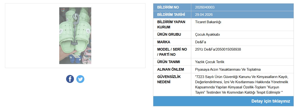 Ticaret Bakanlığı, Güvensiz Ürün Bilgi Sistemi üzerinden sağlık açısından risk taşıyan ürünleri kamuoyuyla paylaşmayı sürdürüyor.