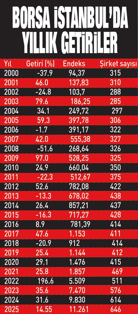 Borsa yüzde 31 olması beklenen 2025 enflasyonuna göre reel olarak ise yüzde 14'e yakın değer kaybetmiş oldu. Endeks 26 Ağustos 2025'te 11.605 puanla tarihinin en yüksek seviyesini görüp 11.529 puanla da kapanış rekoru kırmıştı. 2025'te BIST 30 Endeksi yüzde 13.6, bankacılık endeksi yüzde 13.6 yükseldi.