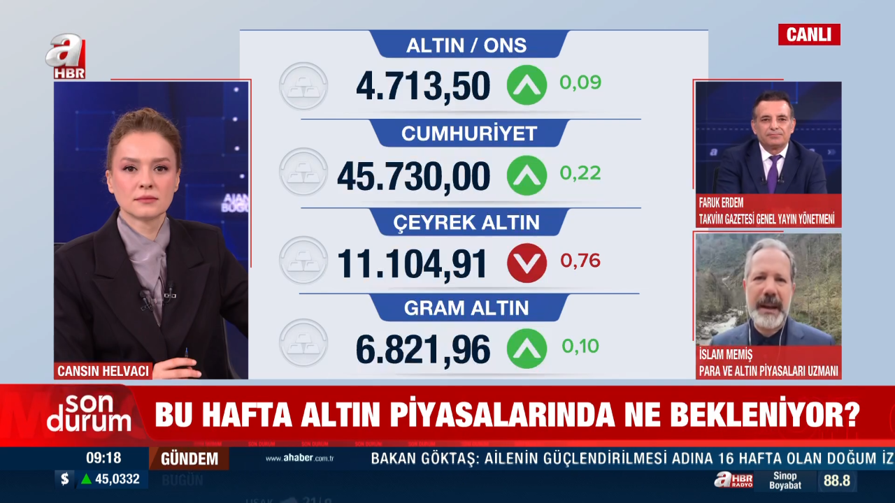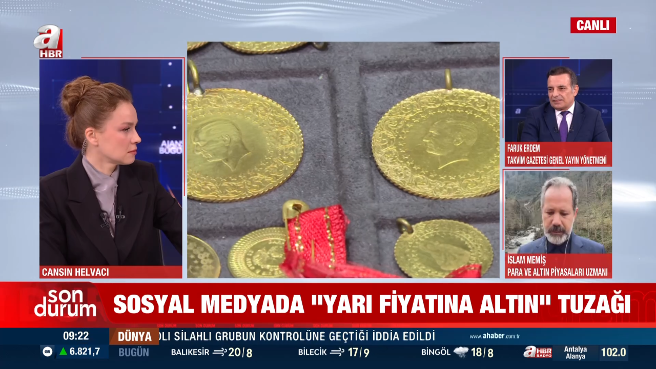Para ve Altın Piyasaları Uzmanı İslam Memiş, A Haber canlı yayınında sosyal medyada dolaşan "yarı fiyatına altın" tuzağına karşı yatırımcıları dikkatli olunması gerektiği konusunda uyardı.