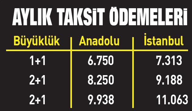 Konutların fiyatı ve taksit tutarları İstanbul ve Anadolu illerinde farklı olacak. Anadolu'da 1+1 konutlar 1 milyon 800 bin lira, 65 metrekarelik 2+1'ler 2 milyon 200 bin lira, 80 metrekarelik 2+1'ler ise 2 milyon 650 bin liradan satışa sunulacak. Anadolu'da 1+1 konutların taksitleri 6 bin 750 lira olacak. 65 metrekarelik 2+1'lerin taksitleri 8 bin 250 lira, 80 metrekarelik 2+1'lerin taksitleri ise 9 bin 938 lira olarak belirlendi. İstanbul'da 1+1 konutlar 1 milyon 950 bin lira, 65 metrekarelik 2+1'ler 2 milyon 450 bin lira, 80 metrekarelik 2+1'ler de 2 milyon 950 bin liradan satışa sunulacak. İstanbul'da 1+1 konutların taksitleri 7 bin 313 lira, 65 metrekarelik 2+1'lerin taksitleri 9 bin 188 lira, 80 metrekarelik 2+1'lerin taksitleri ise 11 bin 63 lira olacak.