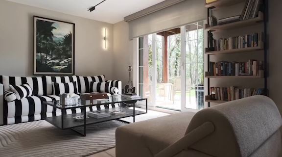 Oturma alanında çizgili bir koltuk tercih eden çift, dikdörtgen formdaki cam sehpayla dekorasyona modern bir hava kazandırdı.