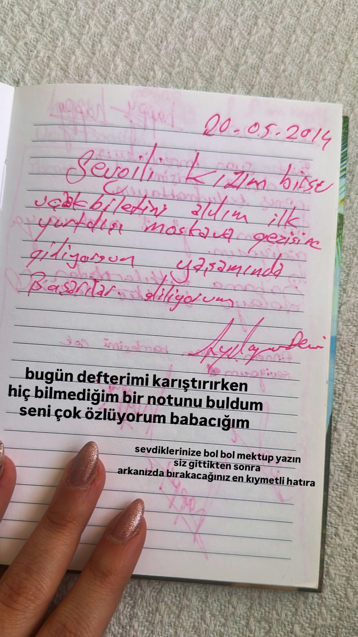 Defteri Instagram hesabından takipçileriyle paylaşan Demir, "Bugün defterimi karıştırırken hiç bilmediğim bir notunu buldum. Seni çok özlüyorum babacığım. Sevdiklerinize bol bol mektup yazın. Siz gittikten sonra arkanızdan bırakacağınız en kıymetli hatıra" sözleriyle üzüntüsünü dile getirdi.