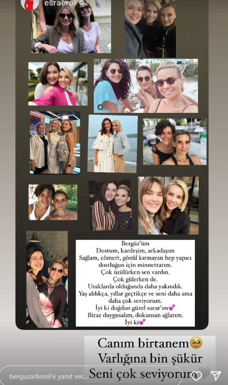 Özellikle Korel'in yakın arkadaşı Esra Erol'un kutlaması dikkatlerden kaçmadı. Erol paylaşımında, "Bergüz'üm dostum, kardeşim, arkadaşım! Sağlam, cömert, gönül kırmayan, hep yapıcı dostluğun için minnettarım. Çok üzülürken sen vardın, çok gülerken de. Uzaklarda olduğunda daha yakındık. Yaş aldıkça, yıllar geçtikçe ve seni daha ama daha çok seviyorum. İyi ki doğdun güzel suratım. Biraz duygusalım, dokunsan ağlarım. İyi ki…" ifadelerini kullandı.