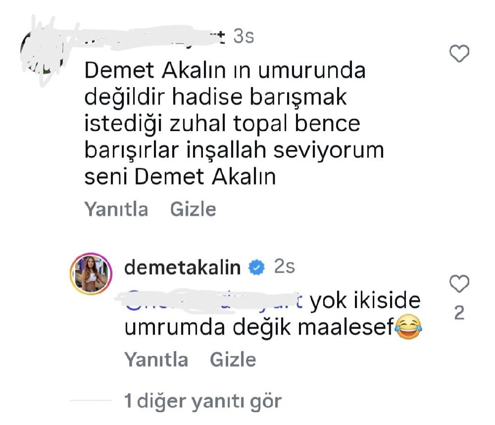 "Demet Akalın'ın umrunda değildir Hadise. Barışmak istediği Zuhal Topal bence." yorumuna ünlü şarkıcı, "Yok ikisi de umrumda değil" yanıtını vererek iki isimi kesin bir dille reddetmişti.