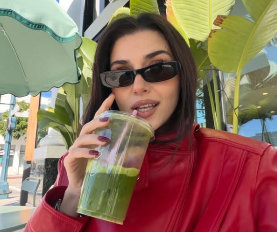 Ayna karşısında verdiği salaş pozlar, kırmızı deri ceketiyle elindeki yeşil içeceği yudumlarken sergilediği havalı tarzı ve sade güzelliği hayranlarını bir kez daha büyüledi.