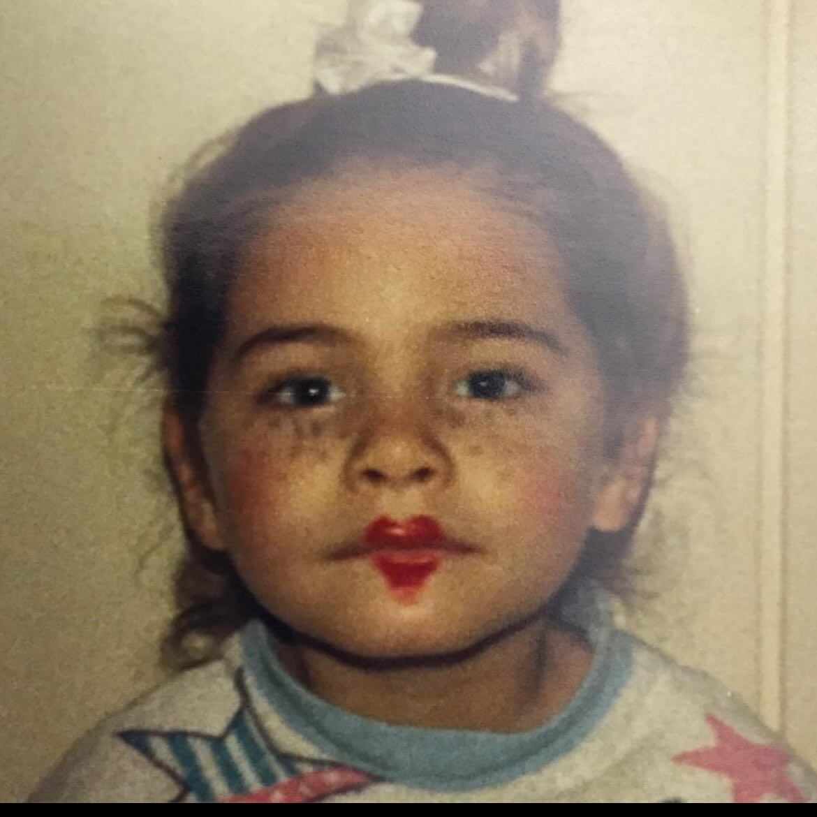 Emel Sayın da, yıllar önce saçında beyaz tokası, üstünde okul önlüğü ve yanağında karakteristik beniyle böyle poz vermiş.