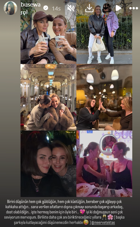 "Birini düşünün hem çok güldüğün hem çok küstüğün. Beraber çok ağlayıp çok kahkaha attığın. Sana verilen sıfatların dışına çıkmayı sonunda başarıp arkadaş, dost olabildiğin. İşte Hermoş benim için öyle biri. İyi ki doğmuşsun seni çok seviyorum Mervoşum. Birlikte daha çok anı biriktireceğimiz yıllara."