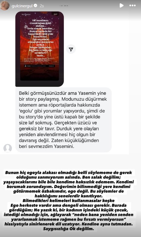 Eski grup üyeleri arasında atışma zaman zaman gündeme gelirken yeni olay patlak verdi. Instagram hesabında paylaşım yapan Yasemin Yörük, bir grubun konserini alıntıladı ve ego göndermesi yaptı. Yörük, "Ego savaşlarının olmadığını görüyoruz açıkça. Tekrar birlikteler... Biz hala ve hala ego savaşları... Yazık..." ifadelerini kullandı.