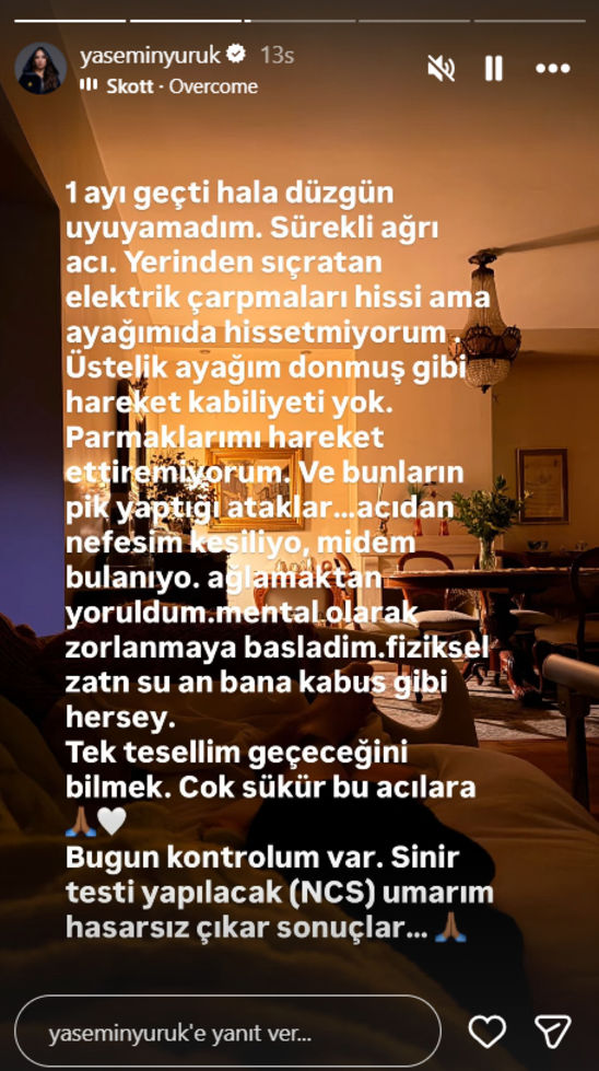 Yürük, sosyal medya hesabından yaptığı paylaşımda, "Bir ayı geçti, hala düzgün uyuyamadım. Sürekli ağrı ve acı çekiyorum. Yerinden sıçratan, elektrik çarpmaları hissi var ama ayağımı hissetmiyorum. Acıdan nefesim kesiliyor, midem bulanıyor. Ağlamaktan yoruldum. Mental olarak zorlanmaya başladım; fiziksel olarak zaten şu an her şey bana kabus gibi geliyor. Tek tesellim geçeceğini bilmek. Çok şükür bu acılara… Bugün kontrolüm var, sinir testi (NCS) yapılacak. Umarım sonuçlar hasarsız çıkar" ifadelerini kullanmıştı.