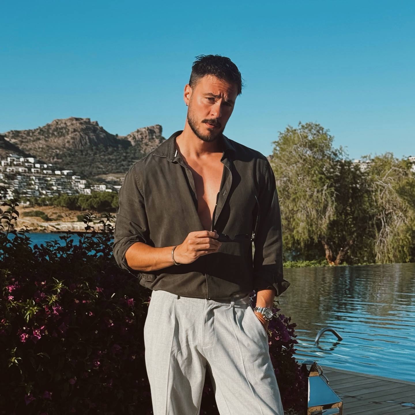 Sabah saatlerinde kızları Alin ve Lina, ile birlikte Yalıkavak'ta konakladıkları otelin plajında görüntülenen oyuncu, kısa bir süre güneşlendikten sonra kızlarının ısrarlarına dayanamayıp denize girdi.