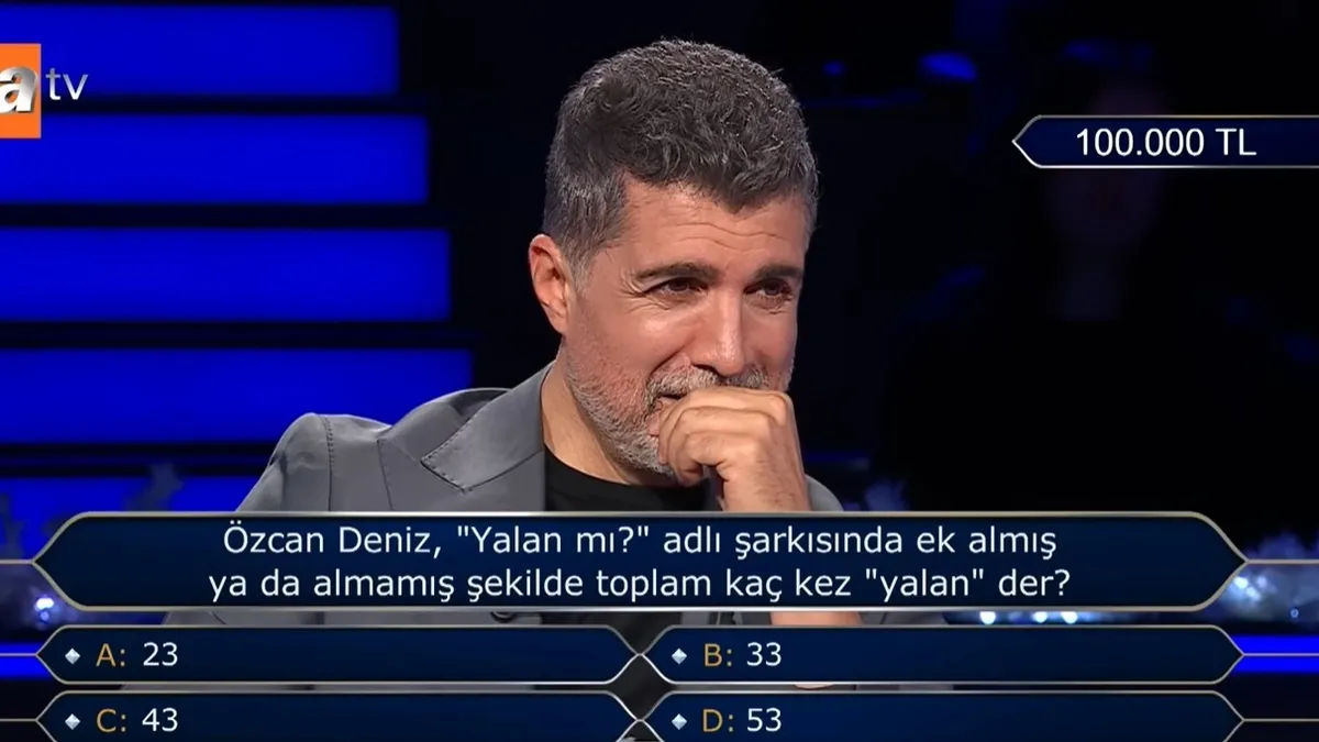 Yarışmada 100 bin TL değerindeki soru açıldığında herkes Özcan Deniz'in bu aşamayı kolaylıkla geçeceğini düşündü. Çünkü soru, sanatçının 90'lı yıllara damgasını vuran ve herkesin ezbere bildiği ikonik şarkısı "Yalan mı?" ile ilgiliydi.