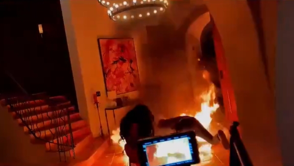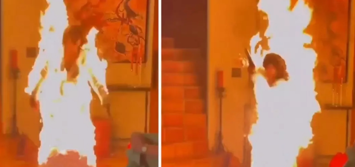 Senaryo gereği alevler bir anda kontrolden çıktı. Katy Perry'nin kıyafeti de bir anda tutuştu.