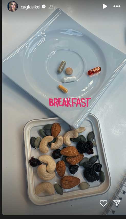 Ünlü manken ve sunucu Çağla Şıkel, sağlıklı yaşam tutkusuyla bir kez daha dikkatleri üzerine çekti. Daha önce sabah kahvaltısında sadece 5 hap ve 30 kuru yemiş tükettiğini paylaşan Şıkel, bu kez yeni kahvaltı tabağıyla sosyal medyada gündem oldu.