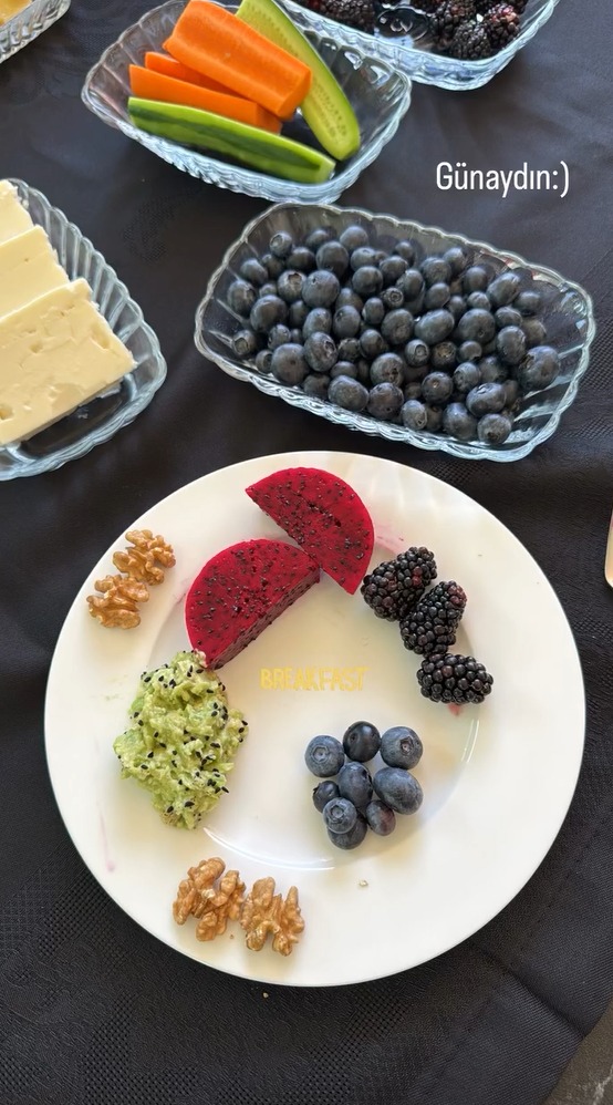 Sosyal medyada "Günaydın :)" notuyla paylaştığı tabağında yok yok ama bir o kadar da az! Ejder meyvesi, avokado ezmesi, böğürtlen, yaban mersini, cevizden oluşan ancak porsiyon bakımından oldukça küçük kalan bu kahvaltısı kısa sürede magazin gündemine bomba gibi düştü.